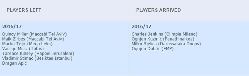 Otišli su Kvinsi Miler, Maik Cirbes, Marko Tejić, Vasa Micić, Tarens Kinsi, Vladimir Štimac i Dragan Apić, dok su crveno-bele pojačali Čarls Dženkins, Ognjen Kuzmić, Milko Bjelica i Ognjen Dobrić. Očigledno je da fali još jedan iskusniji plejmejker, kao i centar, pa ćemo videti kako će Dejan Radonjić sa saradnicima da se snađe kada su nova pojačanja u pitanju.
