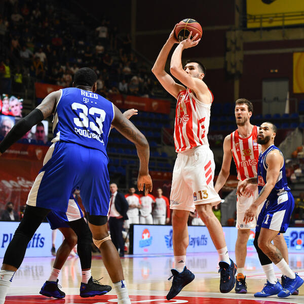 24. minut - stala je Zvezda u napadu, promašuje Lojd, ali ne i Nikolić - pogodio je svih pet šuteva za tri poena - 57:52.