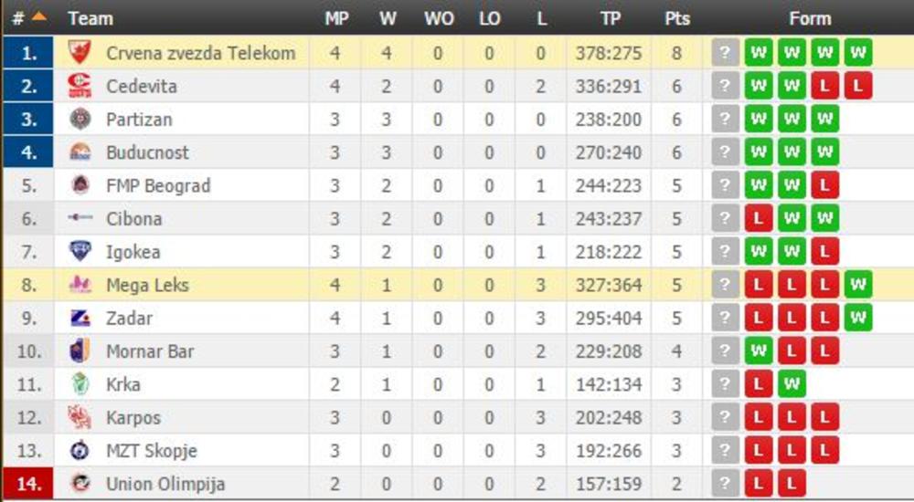 Crvena zvezda - Mega Leks 96:76 Olimpija - Mornar 19.00 MZT - Cibona 21.00 Budućnost - Krka 21.00
