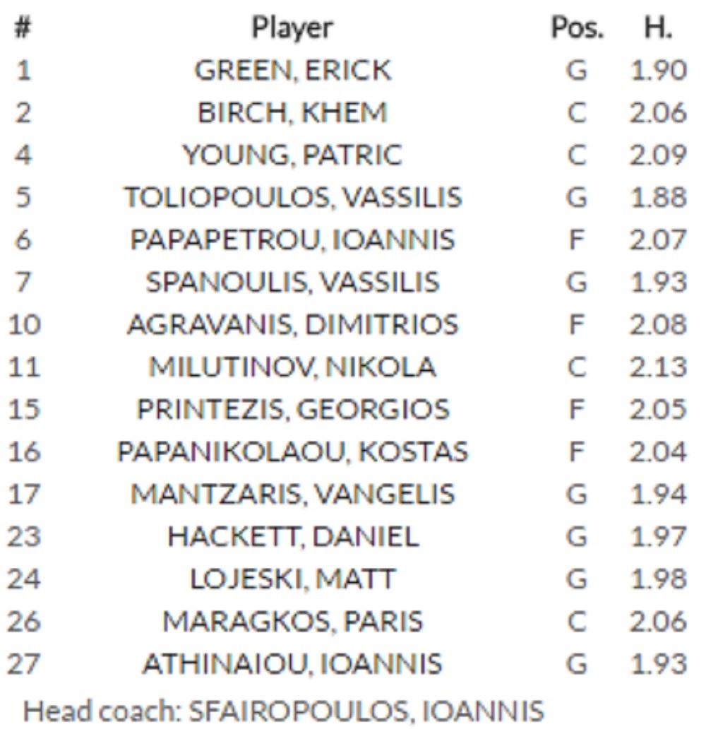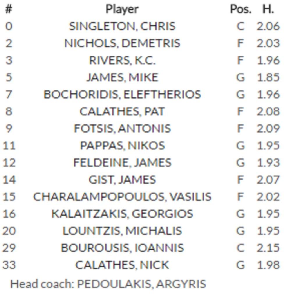Trener: Argiris Pedulakis Igrači: Demetris Nikols, Kris Singlton, Kej Si Rivers, Majk Džejms, Pat Kalates, Jorgos Kalaickis, Mihalis Luntizis, Janis Burusis