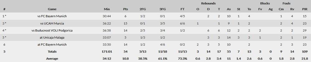 Naime, srpski košarkaš je na pet odigranih utakmica u okviru evropskog takmičenja prosečno beležio 11 asistencija po meču (dva puta po 10 protiv Bajern Minhena, 9 protiv Mursije, 12 protiv Budućnosti i 14 protiv Unikahe), što je zaista neverovatan podatak.