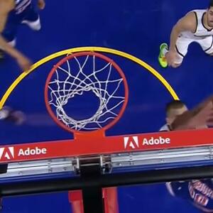 Srpski centar je pratio poslednji nalet Ratnika na utakmici, odlično procenio da će Stef Kari loptu uputiti pod koš i blokirao Džonatana Kumingu.