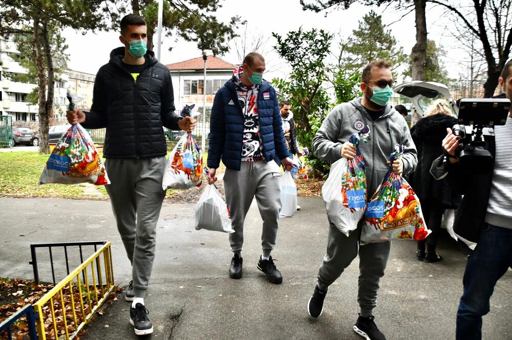 Košarkaši Partizana posetili su danas Dom za decu bez roditeljskog staranja "Drinka Pavlović" na Senjaku i podelili štićenicima novogodišnje paketiće.