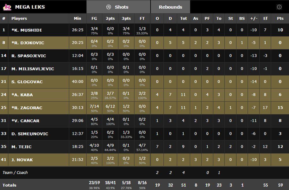 Rade Zagorac je bio ponajbolji u Mega Leksu sa 15 poena i 11 skokova, a pored njega jedini dvocifreni su još bili Mušidi sa 10 i Marko Tejić sa 12 poena.