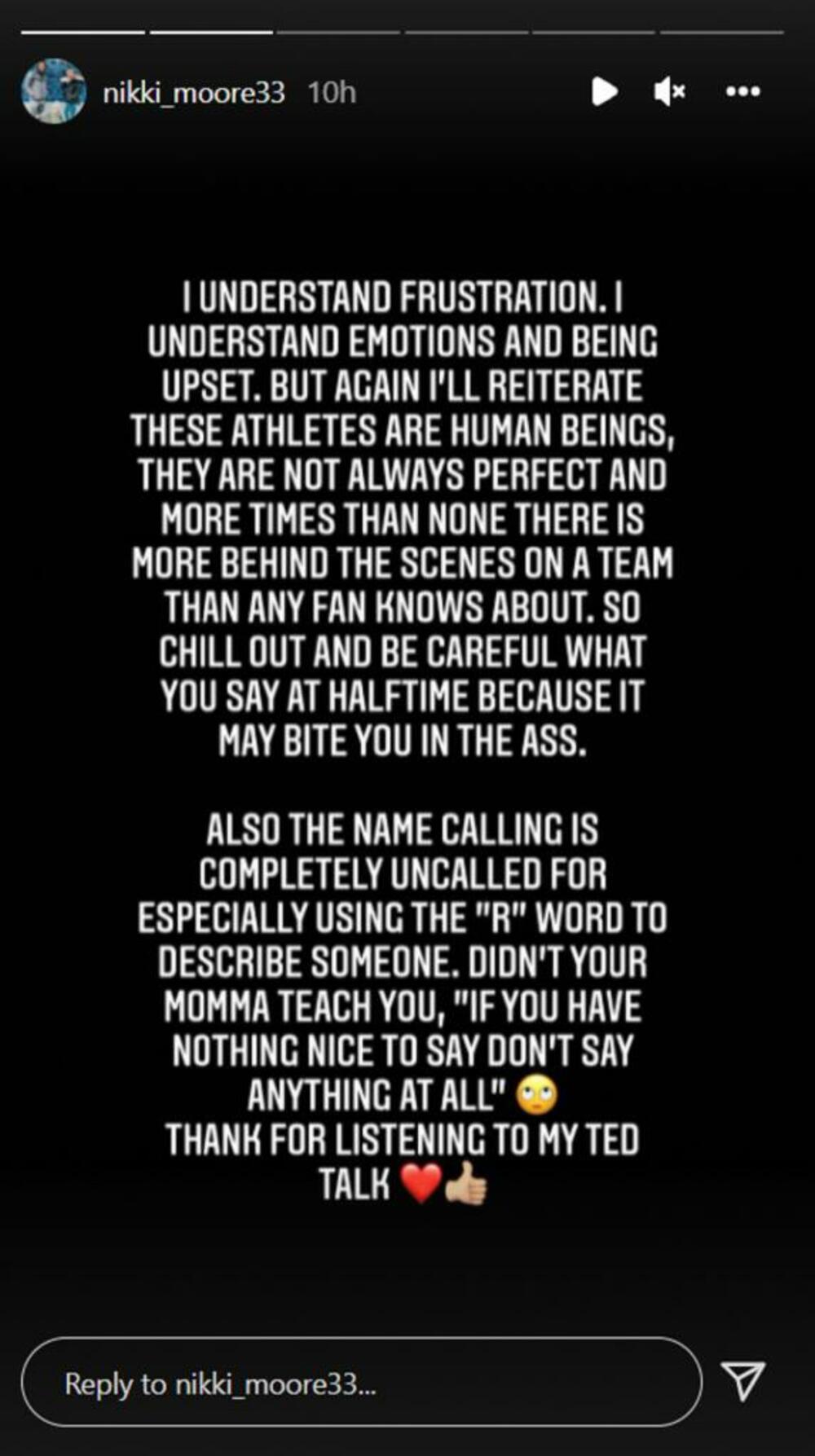 - Razumem frustracije, razumem emocije i nezadovoljstvo, ali ponoviću opet, sportisti su ljudska bića i nisu uvek savršeni, ima mnogo toga što je iza zavese i o čemu ne znate ništa. Opustite se, budite oprezni šta pričate na poluvremenu jer kasnije može da se desi nešto što će vas ujesti za zadnjicu. Takođe, nema potrebe da koristite reč na 'r' da opišete nekog, da li vas mama nije učila, bolje je ćutati ako nemate šta da kažete- napisala je ona nakon meča.
