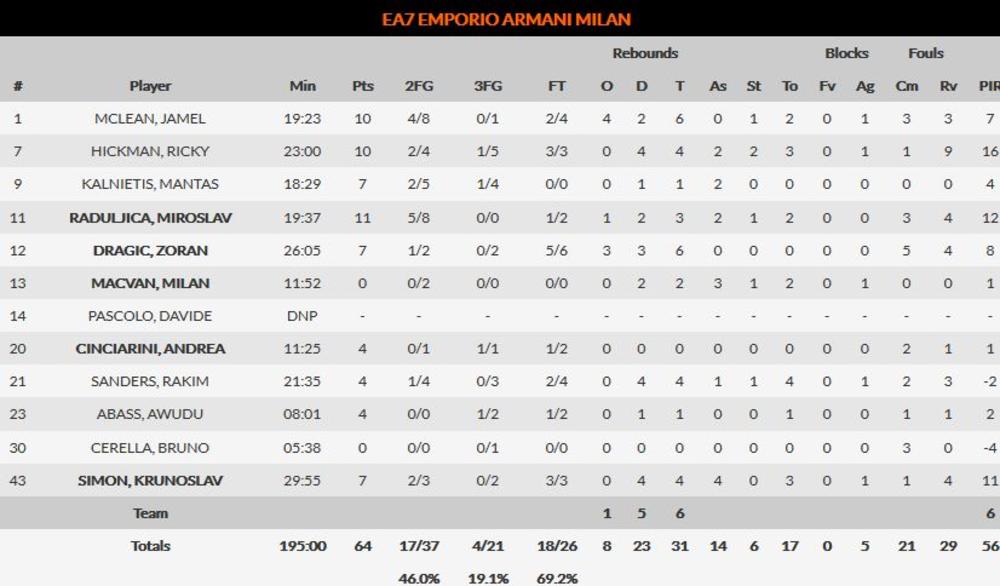 U domaćem timu najefikasniji je bio Miroslav Raduljica sa 11 poena, dok se MIlan Mačvan nije upisao u listu strelaca.
