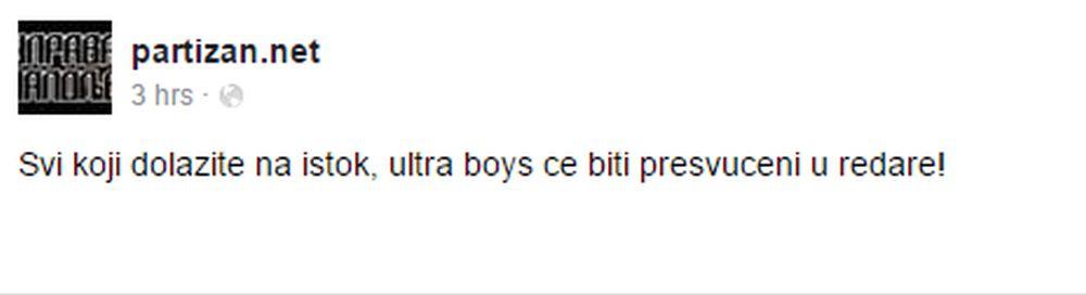 Samo par sati uoči ovog duela se na internetu pojavilo upozorenje od strane Grobara svim navijačima Partizana koji planiraju da se nađu na istočnoj tribini.