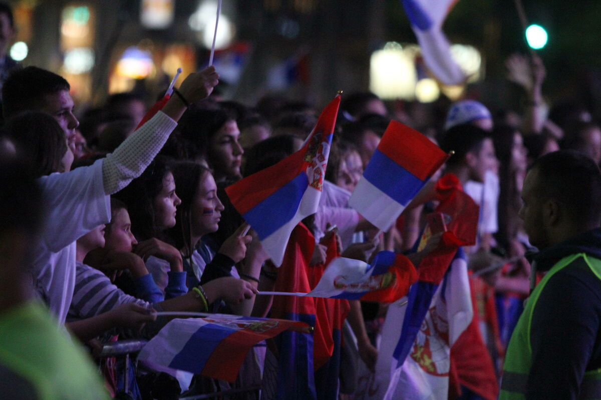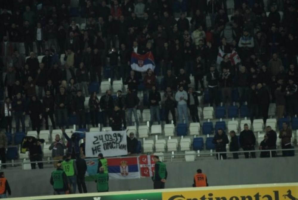 Na tribinama je prisutno i stotinjak navijača naše reprezentacije, a oni su istakli transparent na kojem piše - 24.03.1999. ne prostim!