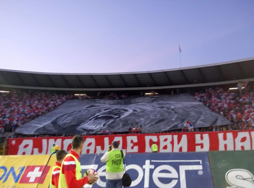 Nakon toga na svim skoro tribinama su puštene dimne bombe u boji tako da u zavisnosti s koje strane gledate možete videti rusku ili srpsku zastavu.