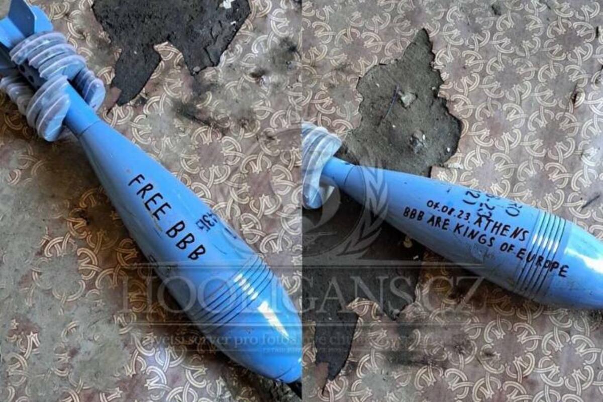 Na jednoj granati piše "FREE BBB", aludirajući tako da uhapšeni pripadnici Bed Blu Bojsa treba da se oslobode, dok je na drugoj stajala još bolesnija poruka "07.07.23. Atina, BBB su kraljevi Evrope".