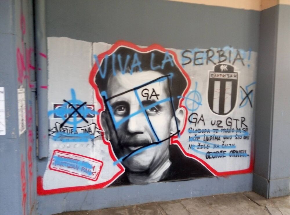 Navijači Rada, Junajted forsi poznati po svom ekstremizmu, nacionalizmu i drugim neprihvatljivim društvenim stavovima su preškrabali mural svojim obeležjima i preko celog Orvelovog lica nacrtali nacistički simbol - kukasti krst.