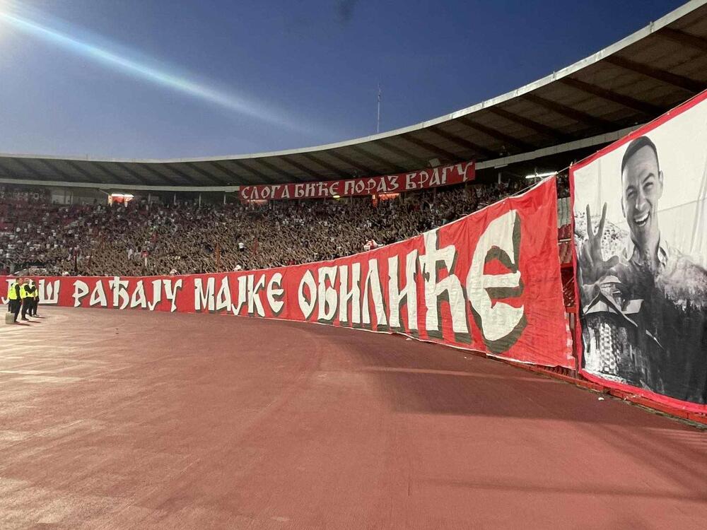 Pristalice Crvene zvezde na početku navijanja skandirale su njegovo ime i prezime, uz transparente "Sloga biće poraz vragu" i "Još majke rađaju Obiliće."