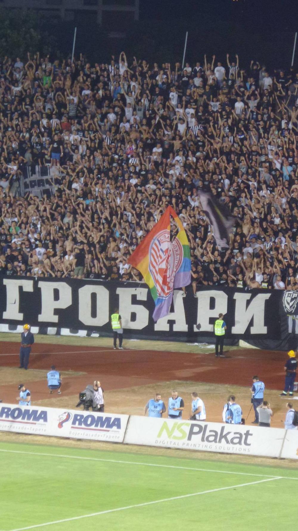 Na tribini sa najvatrenijim pristalicama crno-belih osvanuo je dobro poznati barjak uperen protiv navijača gostiju i Crvene zvezde, sa motivima LGTB zajednice.