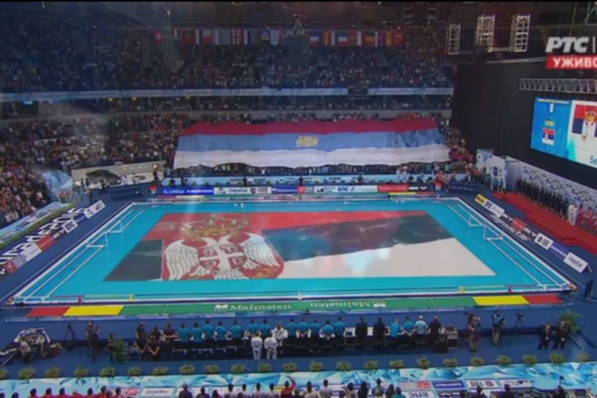 Tokom izvođenja himni pre početka meča između Srbije i Hrvatske posle zvaničnog otvaranja Evropskog prvenstva u Beogradskoj areni, srpski navijači su razvili ogromnu srpsku zastavu koja je pokrila skoro čitavu tribinu.