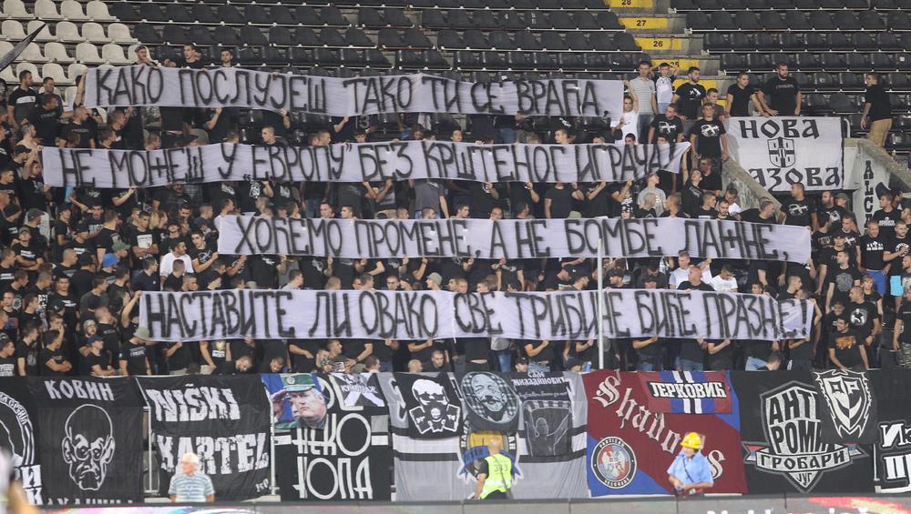 Najverniji navijači razvili su na južnoj tribini stadiona Karađorđe transparent u pauzi između dva dela igre na kome je pisalo ''uprava napolje.''