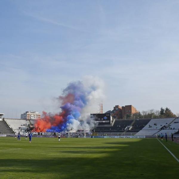 Na početku meča protiv Proletera u Humskoj, navijači crno-belih su odmah počeli sa pevanjem i skandiranjem uvredljivih parola za večitog rivala i njegove navijače.