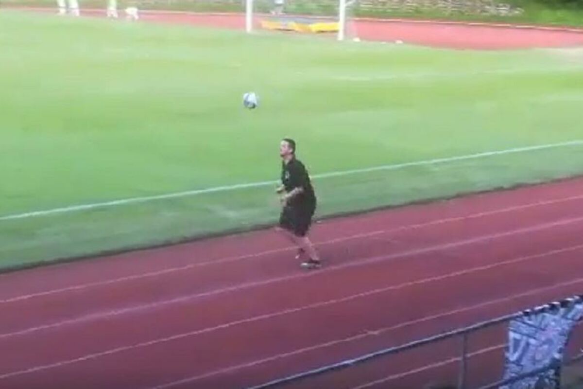 Naime, on je iskoristio to što na ovakvim mečevima nema obezbeđenja niti policije i utrčao na atletsku stazu, dokopao se lopte i krenuo da pimpuje pokraj terena, što je izazvalo oduševljenje navijača na tribinama.