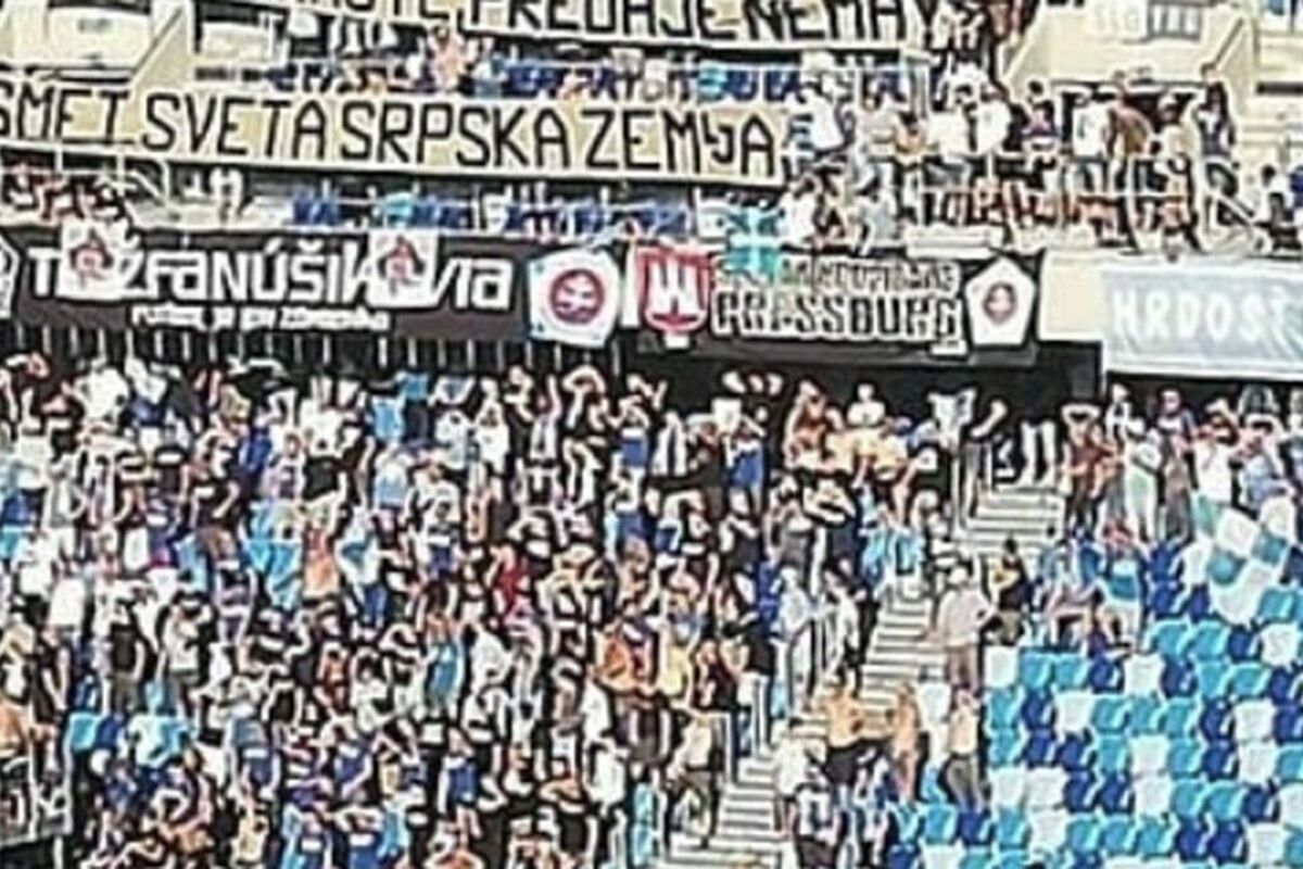 Navijači Slovana iz Bratislave ne da nisu ustuknuli pred pretnjama UEFA rigoroznim sankcijama, već su rešili da gurnu prst u oko Evropskoj fudbalskoj uniji, ali i čitavom svetu svojom podrškom Srbiji i srpskom narodu.