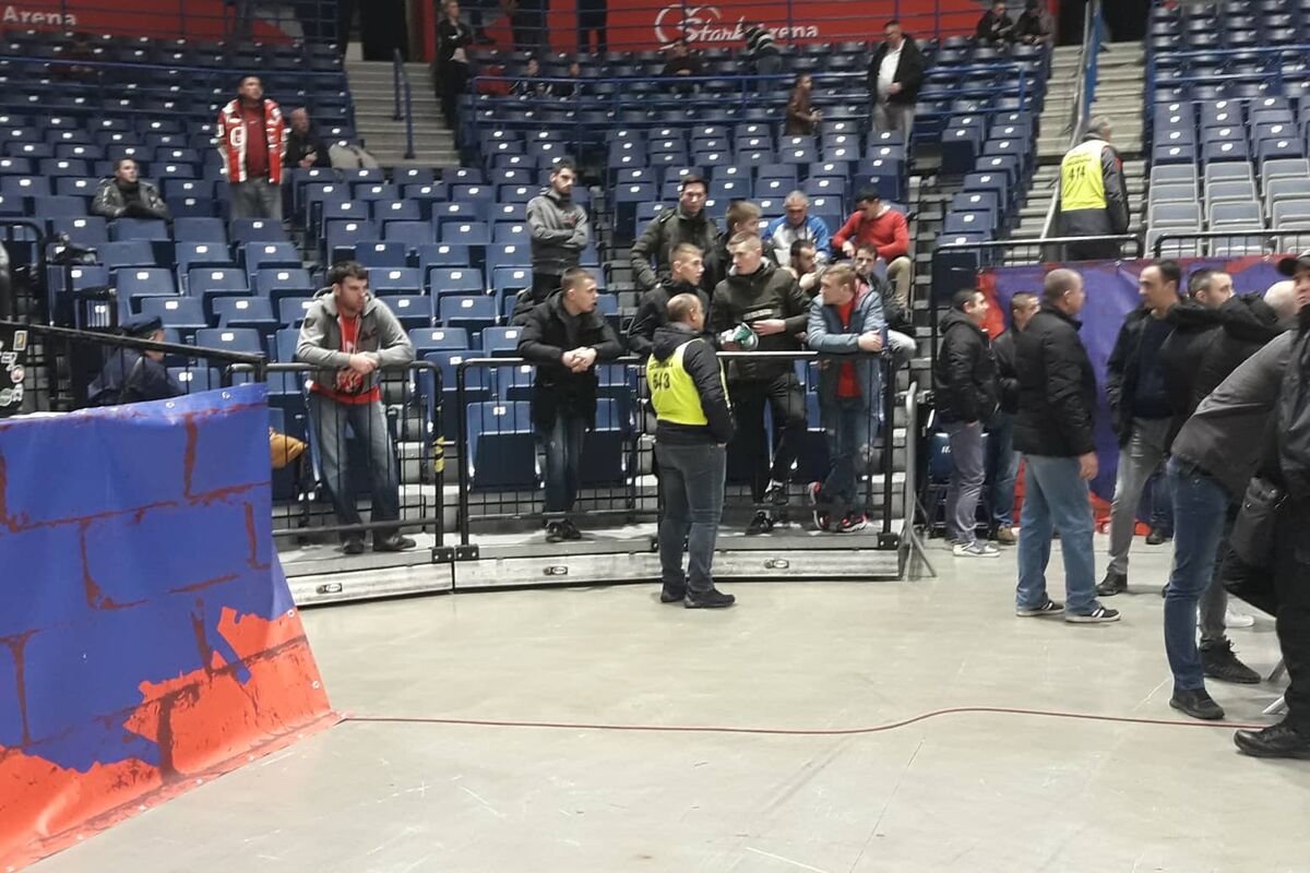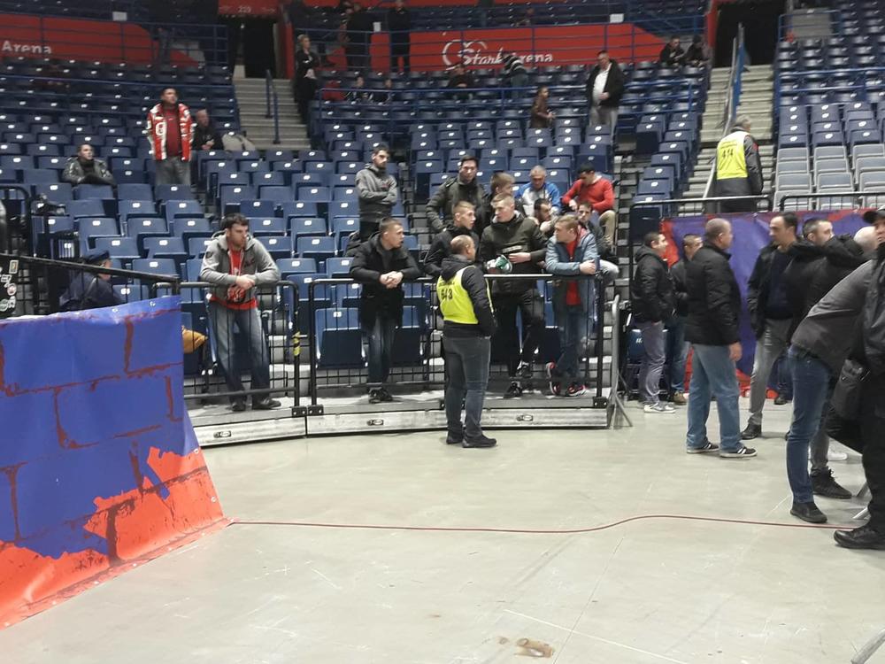 Publika polako pristiže u halu, a gostujći navijači, njih desetak, želelo je da okači zastavu svog kluba.
