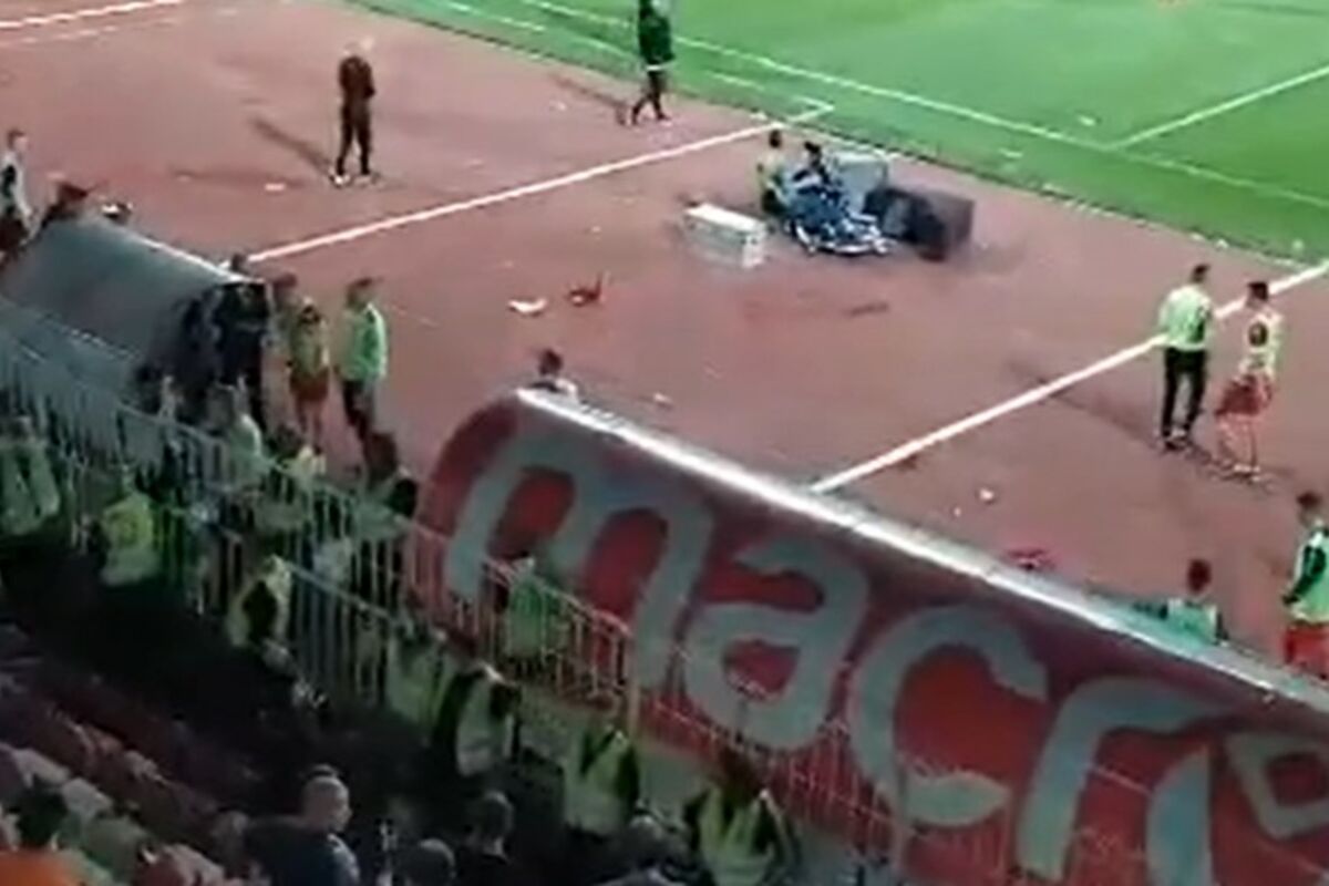 U jednom trenutku došlo je do incidenta na tribinama, pa je parče stolice završilo u pravcu Dragana Šarca, trenera Vojvodine