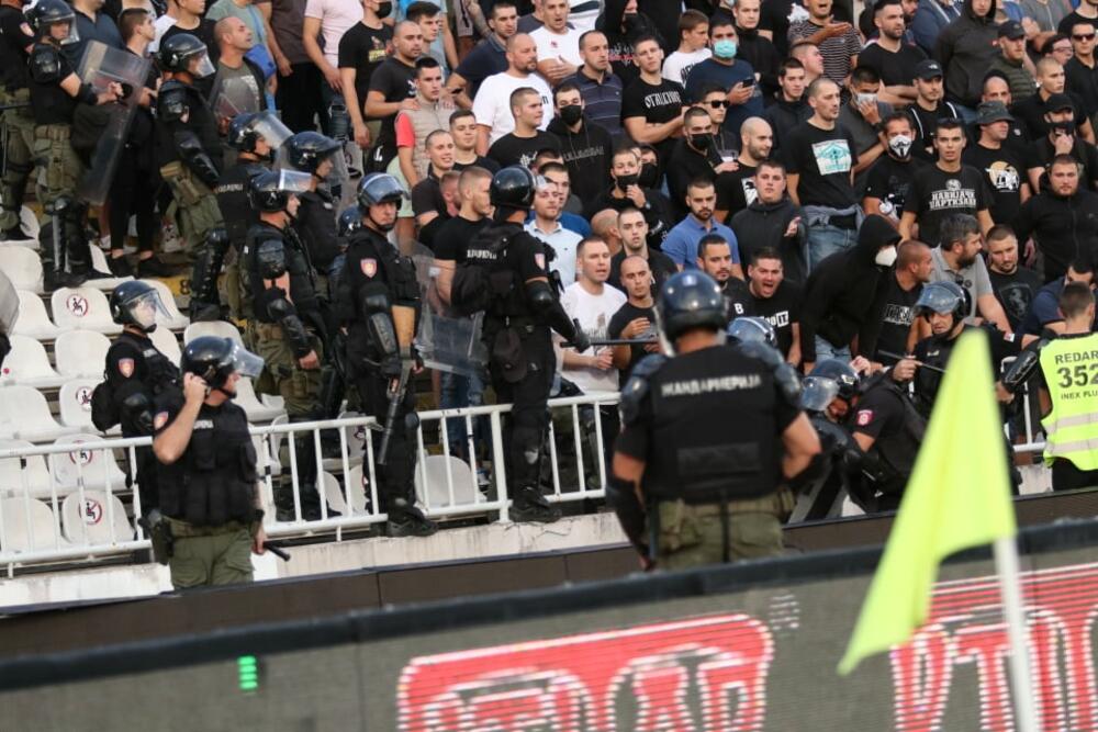 Na samom početku utakmice izbila je tuča između navijača grobara na istočnoj tribini.