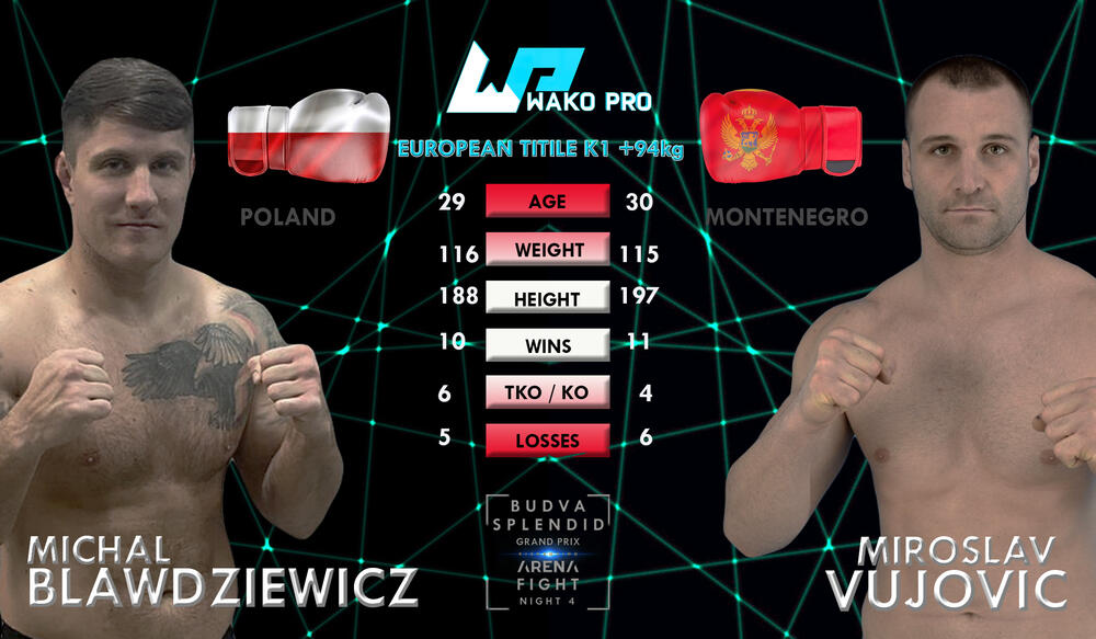 22:10 GLAVNI MEČ: Miroslav Vujović (MNE) - Mikal Blavdivič (POL) K1, +94 kg, 5 x 3 min