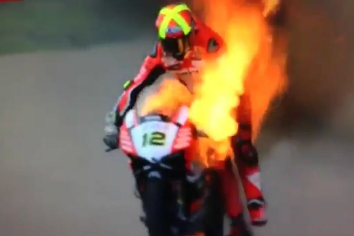 Ono što je najiznenađujuće jeste da u trenutku kada je motocikl počeo da gori i plamen dohvatio vozača, on je nastavio dobrih 15 sekundi da ga vozi dok se nije sklonio van staze i tek onda skočio sa njega.