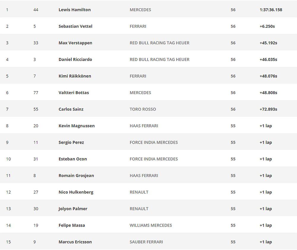 Ipak, naslednik nekadašnjeg holandskog vozača Josa Verštapena je uspeo da odbrani svoju poziciju i od klupskog kolege, ali i od Kimija Raikonena koji je takođe napadao i nađe se na podijumu iako je bio startovao tek sa 19. mesta.
