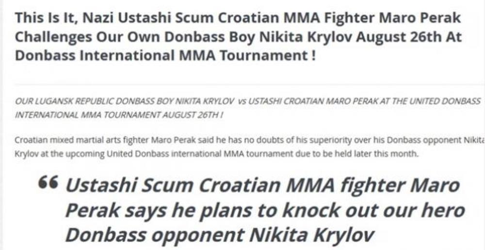 - Naci-ustaško smeće, hrvatski MMA borac Maro Perak, kaže da planira da nokautira našeg heroja iz Donbasa, Nikitu Krilova - prenosi "Fight site" pisanje jednog ruskog portala.