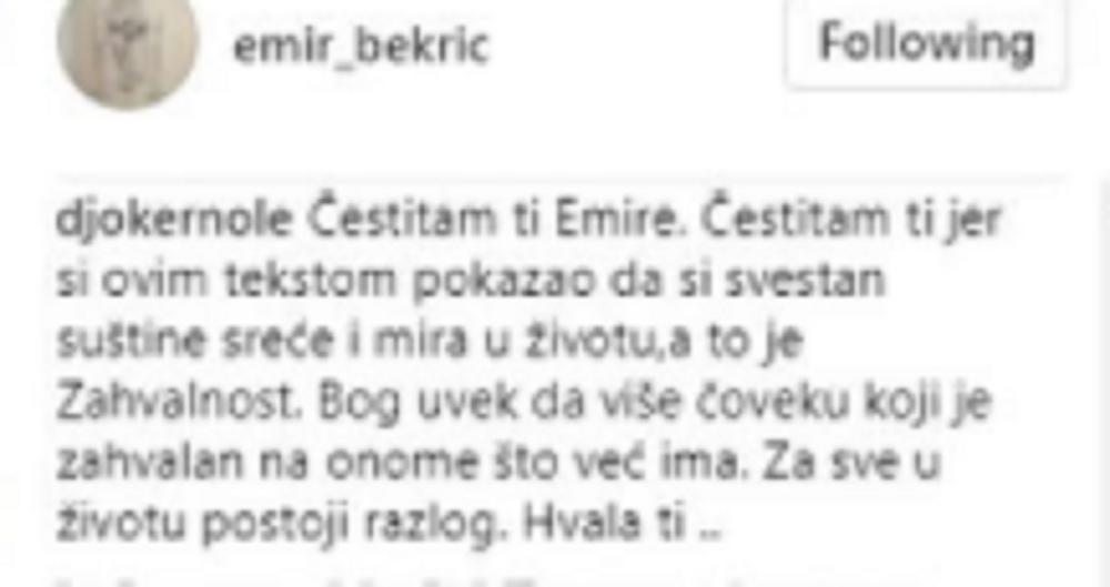 - Čestitam ti Emire. Čestitam ti jer si ovim tekstom pokazao da si svestan suštine sreće i mira u životu, a to je Zahvalnost. Bog uvek da više čoveku koji je zahvalan na onome što već ima. Za sve u životu postoji razlog. Hvala ti... - napisao je najbolji srpski teniser.