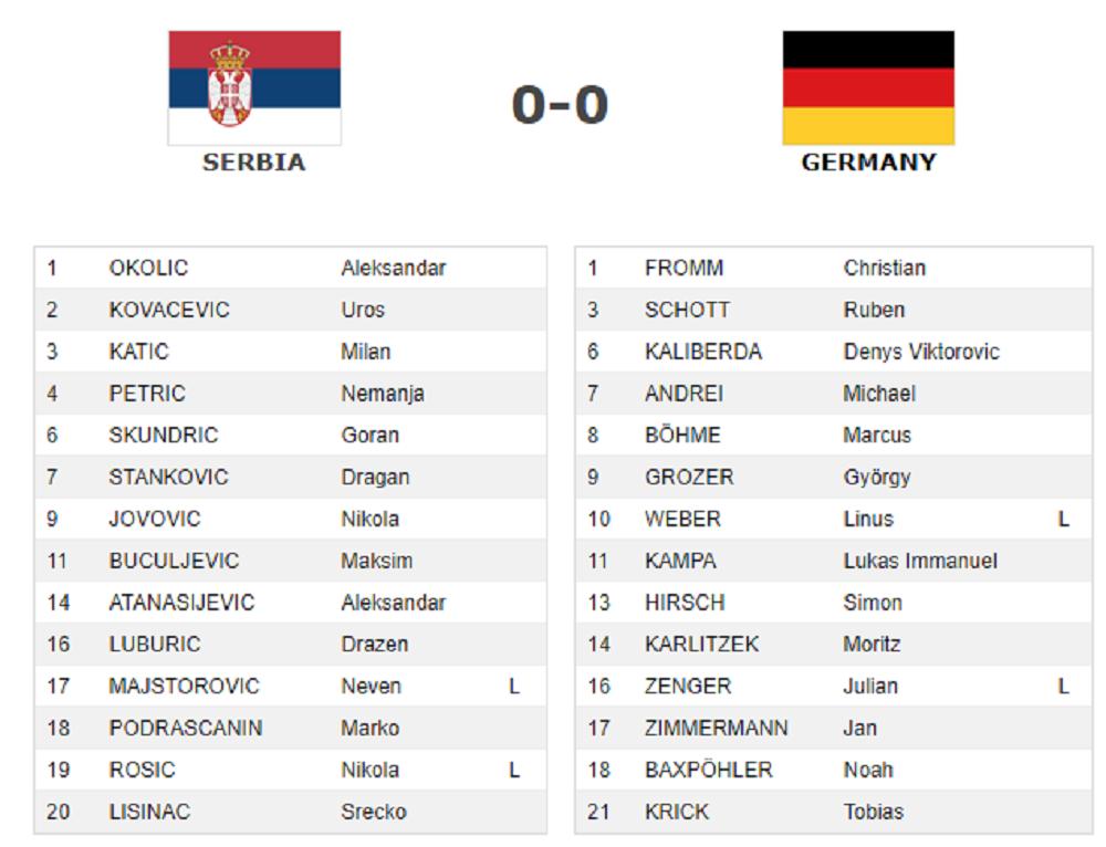 Srbija: Okolić, Kovačević, Katić, Petrić, Skundrić, Stanković, Jovović, Buculjević, Atanasijević, Luburić, Majstorović, Podraščanin, Rosić, Lisinac.