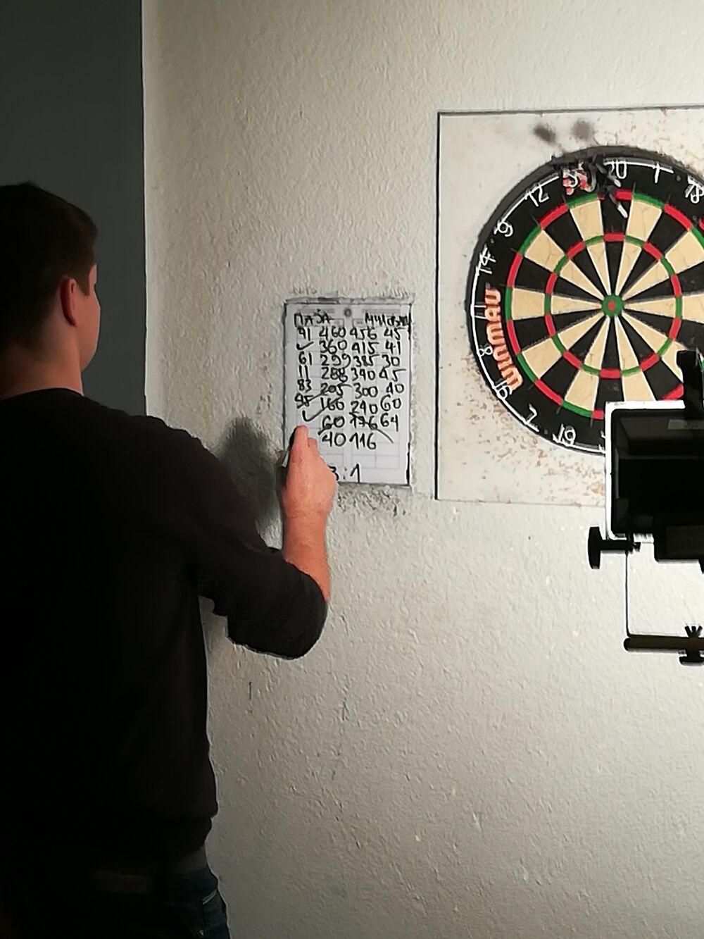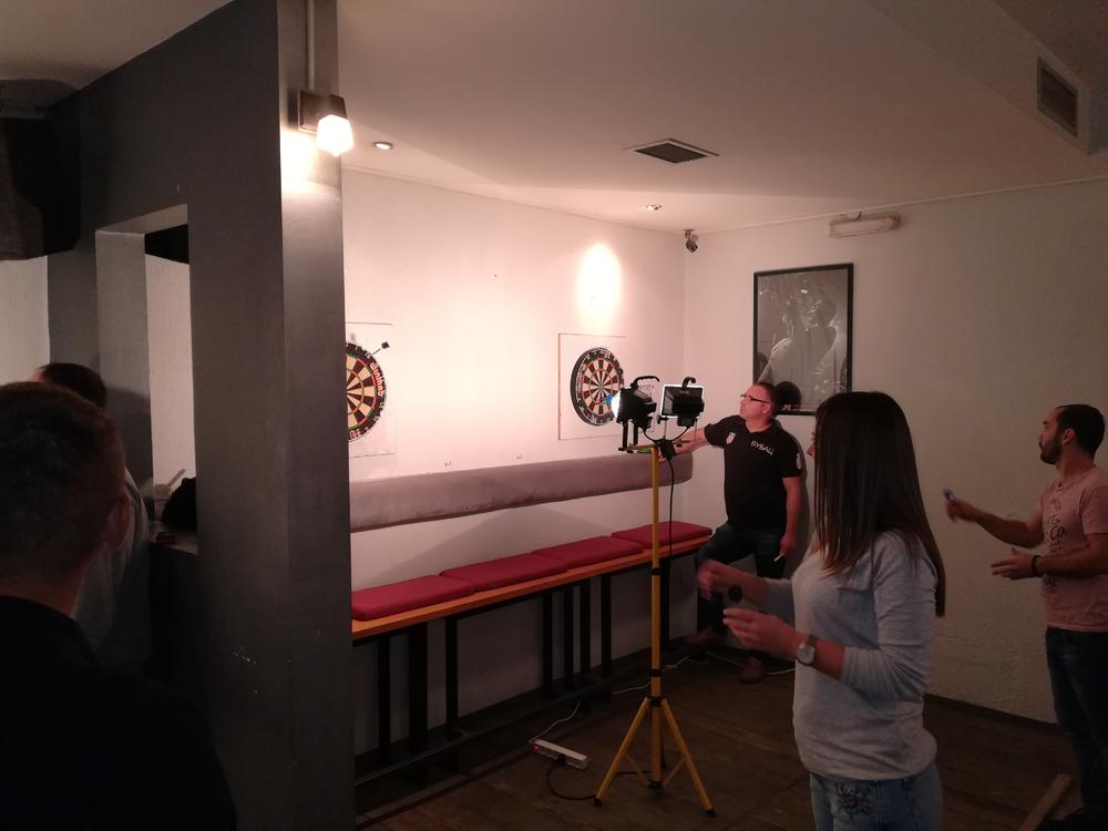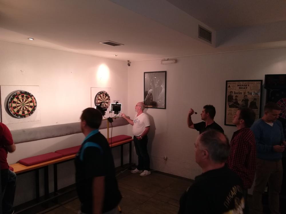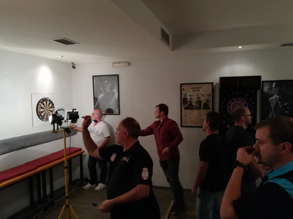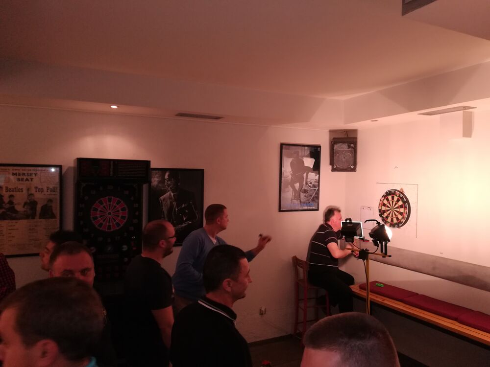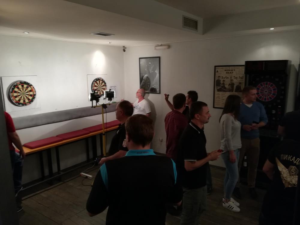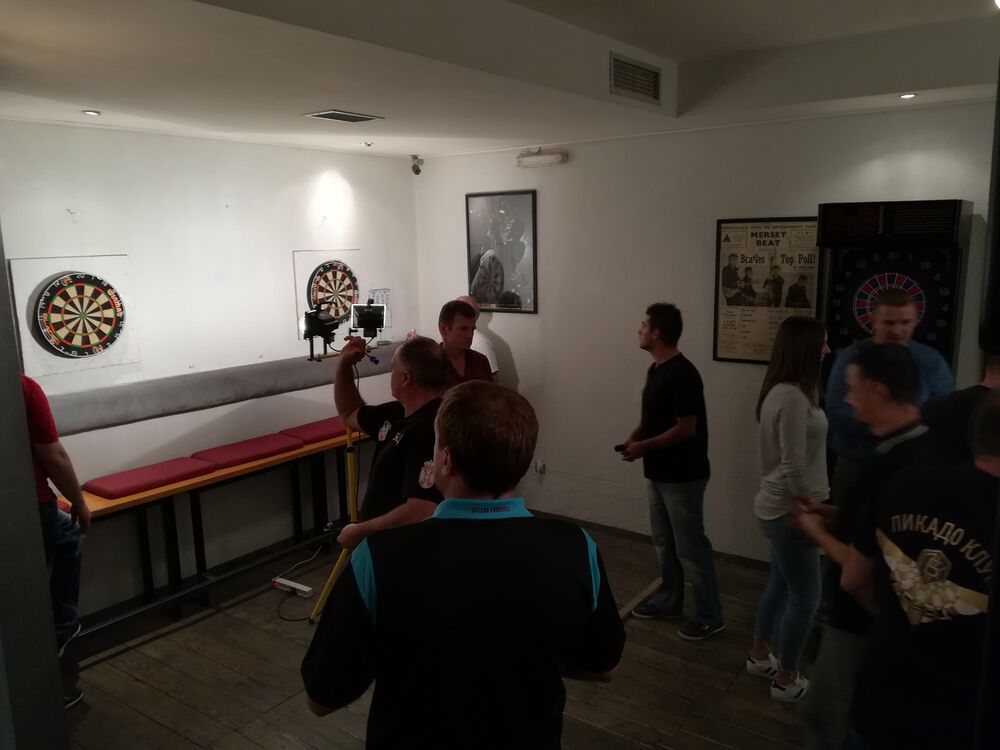 Šest pikado tabli raspoređenih na okolnim zidovima sa reflektorima uperenim u njih, ozbiljna lica kod većine onih koji igraju, dok oni koji čekaju na svoj red stižu i da se šale međusobno, a na stolovima, ono što sam i očekivao i navikao, čaše s pivom, mada je bilo i sokova i drugih pića, jer ne moraju svi da cirkaju dok igraju. Ipak, pušenje je zabranjeno.