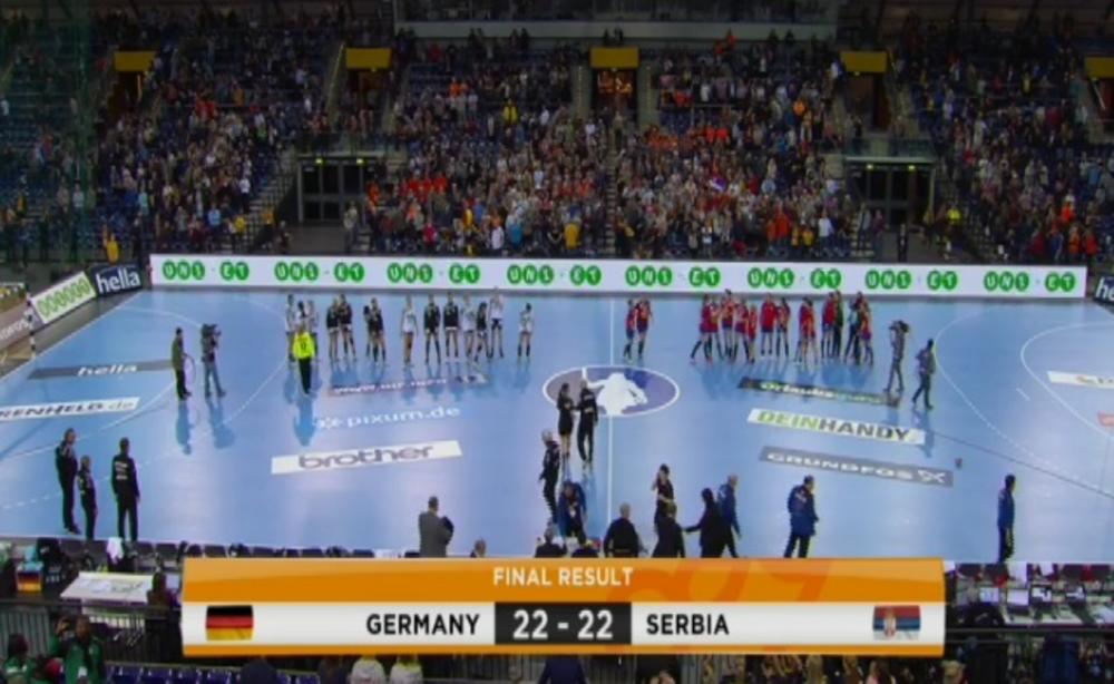 Rukometašice Srbije remizirale su dramatičnom meču u trećeg kola Svetskog prvenstva sa domaćinom Nemačkom rezultatom 22:22.