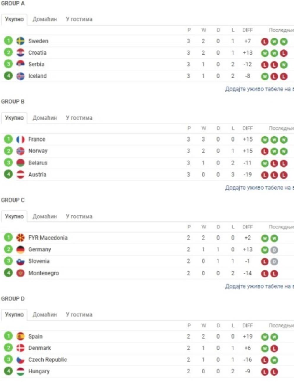 Tabela nove grupe izgleda ovako: Francuska 4, Švedska 2, Hrvatska 2, Norveška 2, Srbija 0, Belorusija 0.