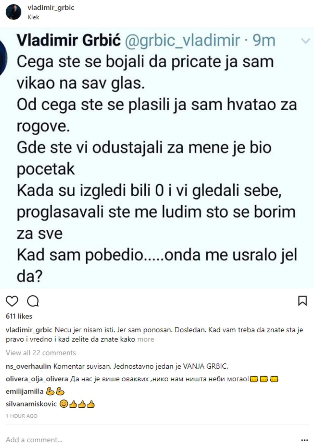 - Čega ste se bojali da pričate, ja sam vikao na sav glas. Od čega ste se plašili, ja sam se hvatao za rogove. Gde ste vi odustajali, za mene je bio početak. Kada su izgledi bili nula i vi gledali sebe, proglašavali ste me ludim što se borim za sve. Kad sam pobedio... onda me je usr*lo je l' da? - okačio je na Tviter popularni Vanja svoj post, a uz sve to dodao: