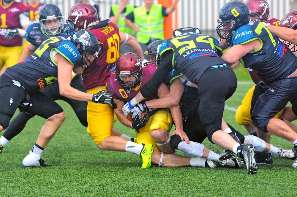 Međutim, odmah je stigao odgovor sa druge stranje, preko Amerikanca Džihada Karija Verčera, koji je izjednačio trčanjem za 32 jarda iz četvrtog pokušaja (7:7), a zatim za preokret uposlio dugogodišnjeg sejftija Ivana Nedeljkovića, koji od ove sezone igra risivera – 14:7.