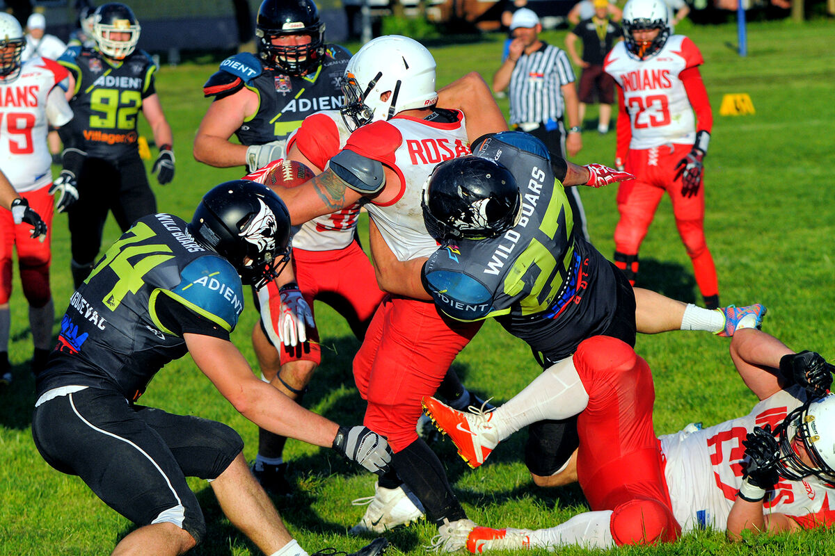 U derbiju trećeg kola Prve lige Srbije Kragujevac Wild Boarsi su trijumfalno okončali neugodno gostovanje Indijancima u Inđiji – 30:21 (0:0, 14:7, 6:7, 10:7).