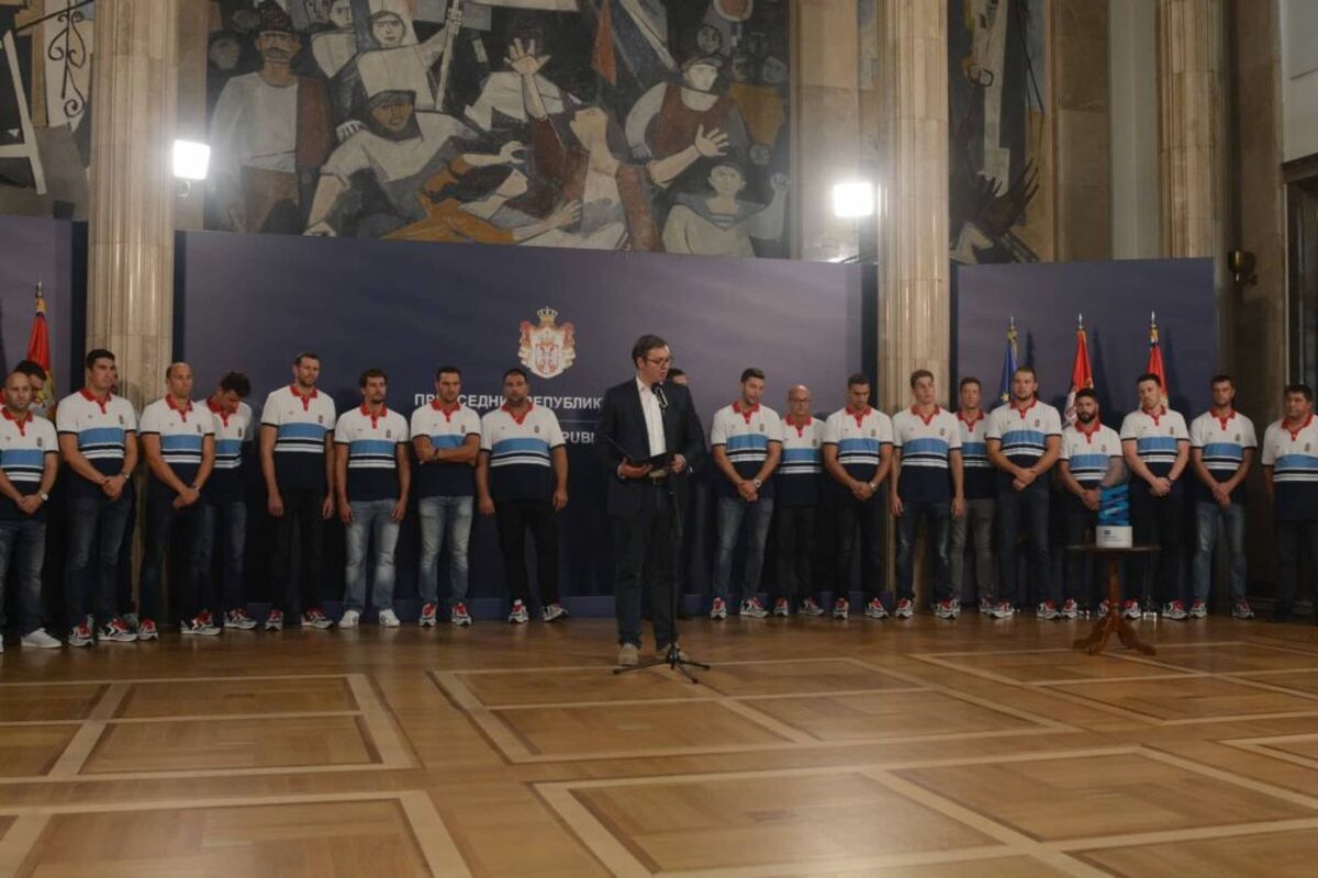 Predsednik Srbije Aleksandar Vučić svečano je primio vaterpoliste koji su u subotu po četvrti put uzastopno postali prvaci Evrope u Barseloni, pobedom nad Španijom u finalu.