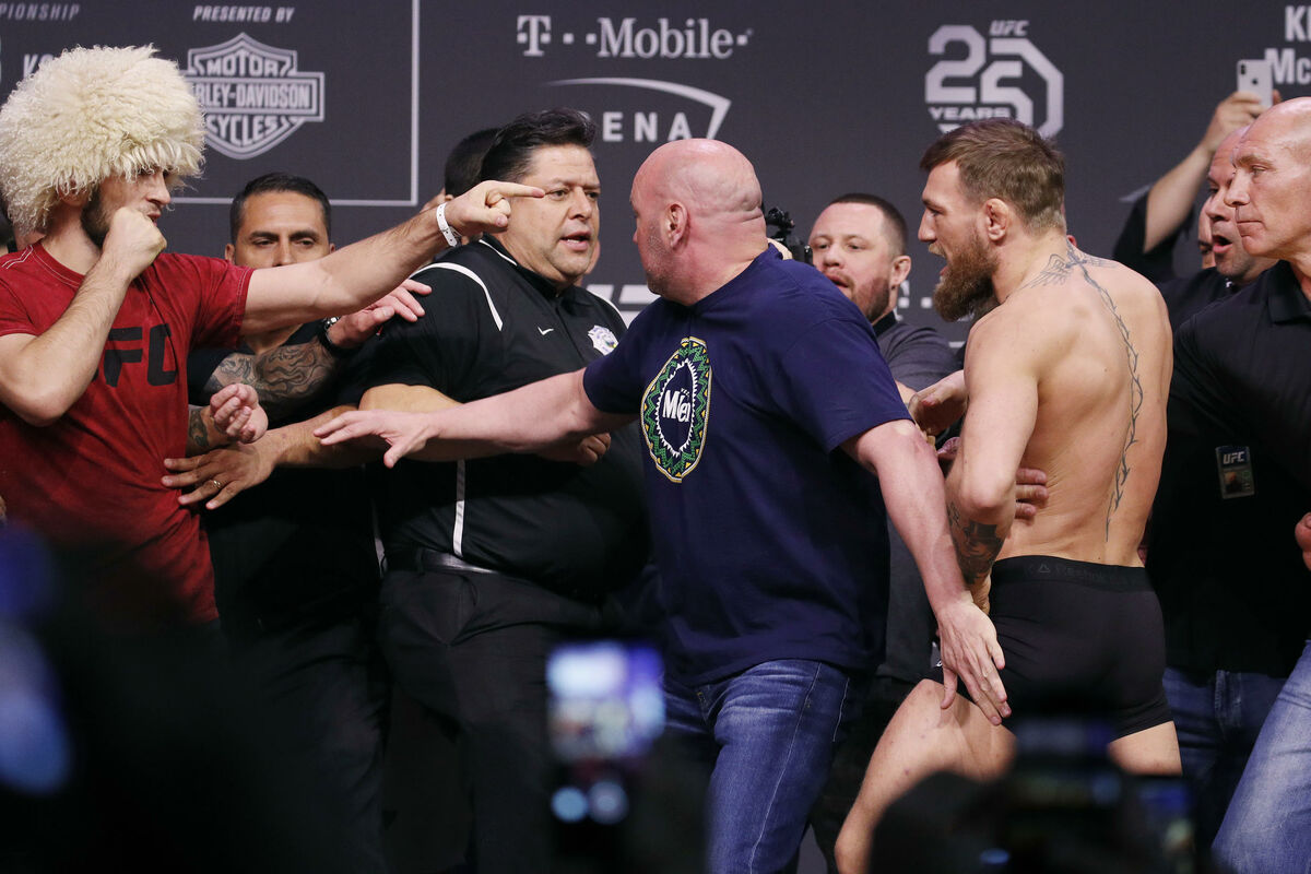 Mekgregor je udario po pesnicama Nurmagomedova prilikom suočavanja, a situacija je bila vrlo napeta i na ivici eskalacije, s obzirom na to da su timovi oba borca bili spremni svakog časa da započnu opštu tuču.