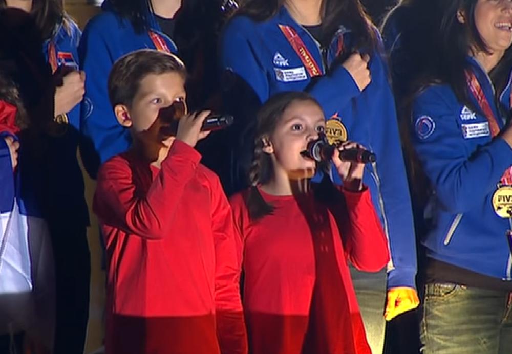 HIMNA: Dečak i devojčica iz hora "Čarolija" su zajedno sa odbojkašicama otpevali Bože pravde