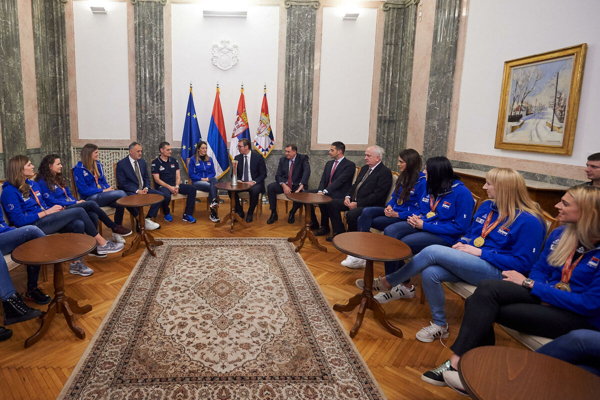 Predsednik Srbije Aleksandar Vučić priredio je u zgradi Generalnog sekretarijata predsednika Republike, prijem za žensku seniorsku reprezentaciju Srbije, koja je na Svetskom prvenstvu u Japanu osvojila zlatnu medalju.