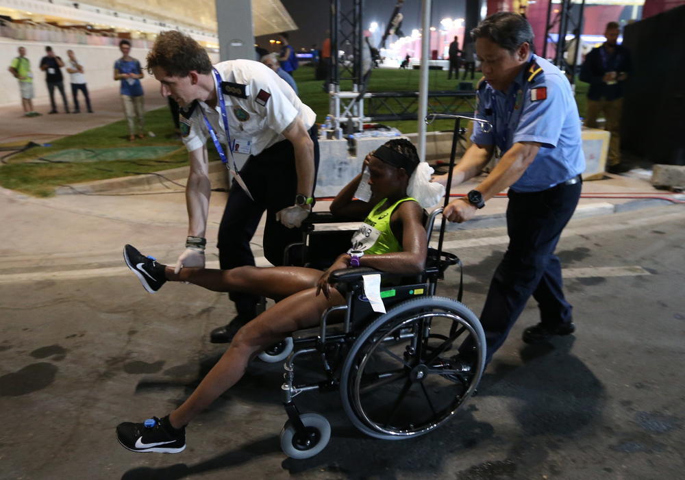 Veliki broj takmičarki noćnog maratona koji se održao u okviru Svetskog prvenstva u Dohi sa staze je izneto na nosilima, u kolicima, na rukama...