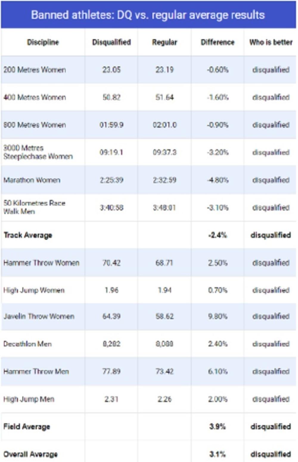Diskvalifikovani rezultati suspendovanih atletičara su bolji od njihovih regularnih rezultata u svih 13 disciplina.