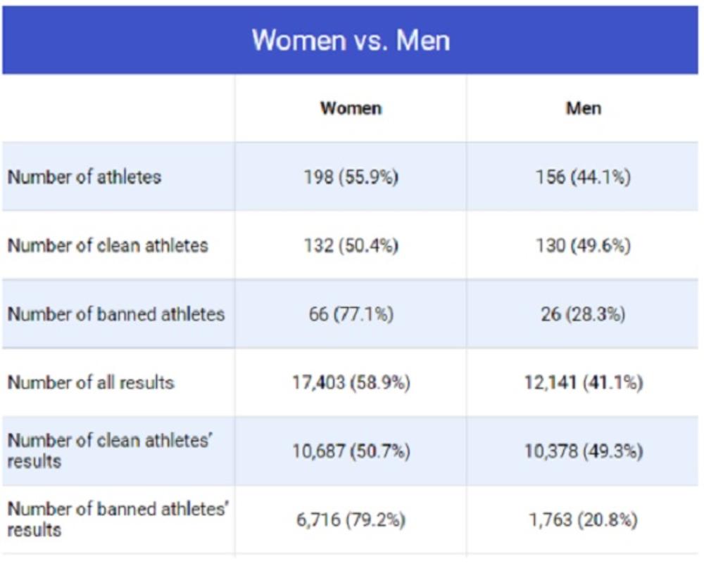 Čisti atletičari su imali bolje rezultate od suspendovanih atletičara u 6 od 24 discipline, i to u 3 track i 3 field discipline. Najveća razlika između ovih atletičara je uočena u disciplini 800 metara, muškarci, gde su čisti atletičari ostvarili čak 12.4% bolje rezultate od suspendovanih. Ova disciplina je takođe jedina gde su čisti atletičari i u ženskoj i u muškoj kategoriji ostvarili bolje rezultate od suspendovanih.