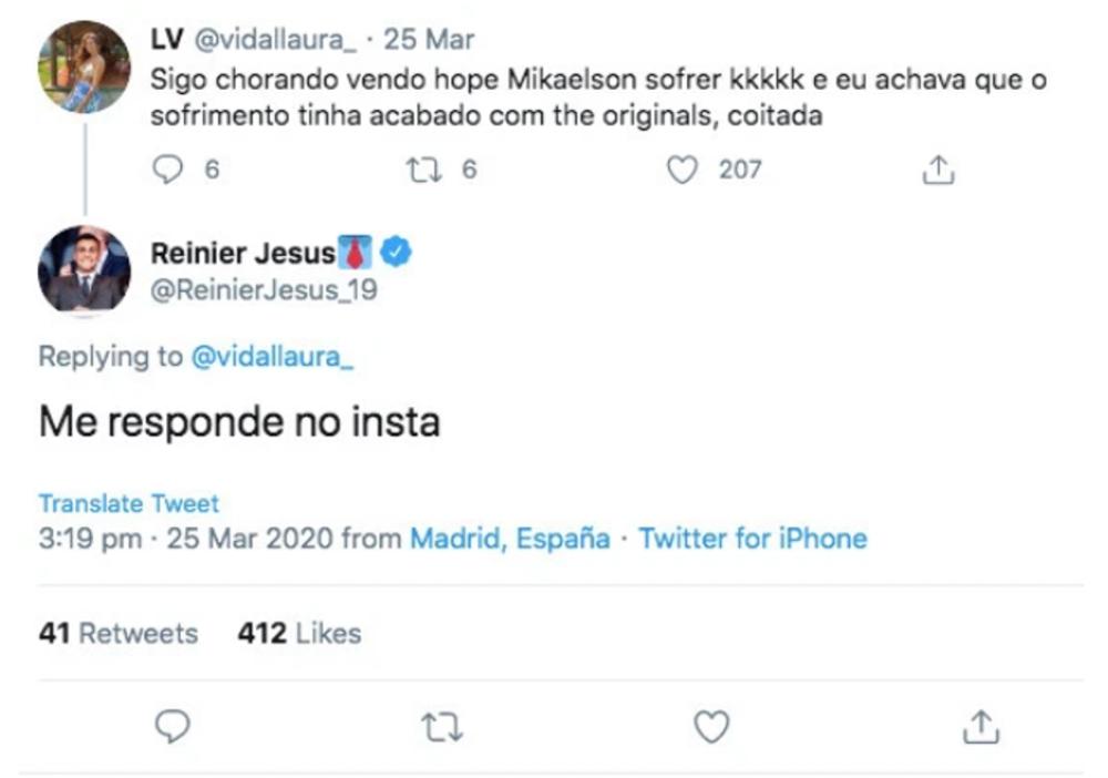 Naime, on se ovih dana u samoizolaciji osećao malo usamljeno pa je "surfovao" po Tviteru i pronašao lepu odbojkašicu Lauru Vidal, zvezdu Dejton Stejt Falkonsa. Laura je rodom iz Rio de Žaneira.