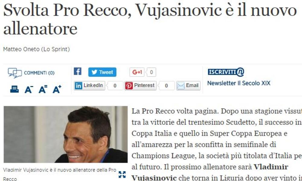 Vladimir Vujasinović je novi trener Pro Reka! Tako makar pišu italijanski mediji! U utorak prepodne je ova informacija najavljena, a već popodne je dobila i potvrdu. Najbogatiji vaterpolo klub na svetu je imao razočaravajuću sezonu u kojoj je ostao bez pehara Lige šampiona, jer je u polufinalu ispao od novog šampiona Evrope, Juga, a cenu za to je platiotrener Amadeo Pomilija.