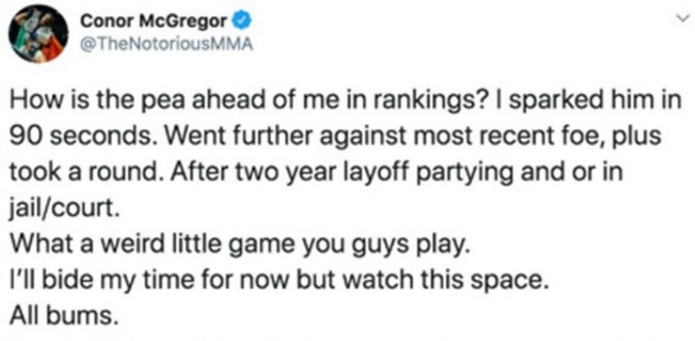 "Kako ova 'piša*ka' može da bude ispred mene u poretku? Razbio sam ga u 90 sekundi. Otišao sam dalje protiv njegovog poslednjeg protivnika, osim toga sam uzeo jednu rundu. Nakon dve godine partijanja i vremena u zatvoru ili na sudu. Čudnu malu igru vi momci igrate. Trenutno ću se povući iz ovoga, ali pripazite. Klošari!", napisao je MekGregor, da bi kasnije objavu obrisao, ali nedovoljno brzo jer su je fanovi i mediji "screenshotom" odmah zabeležili.