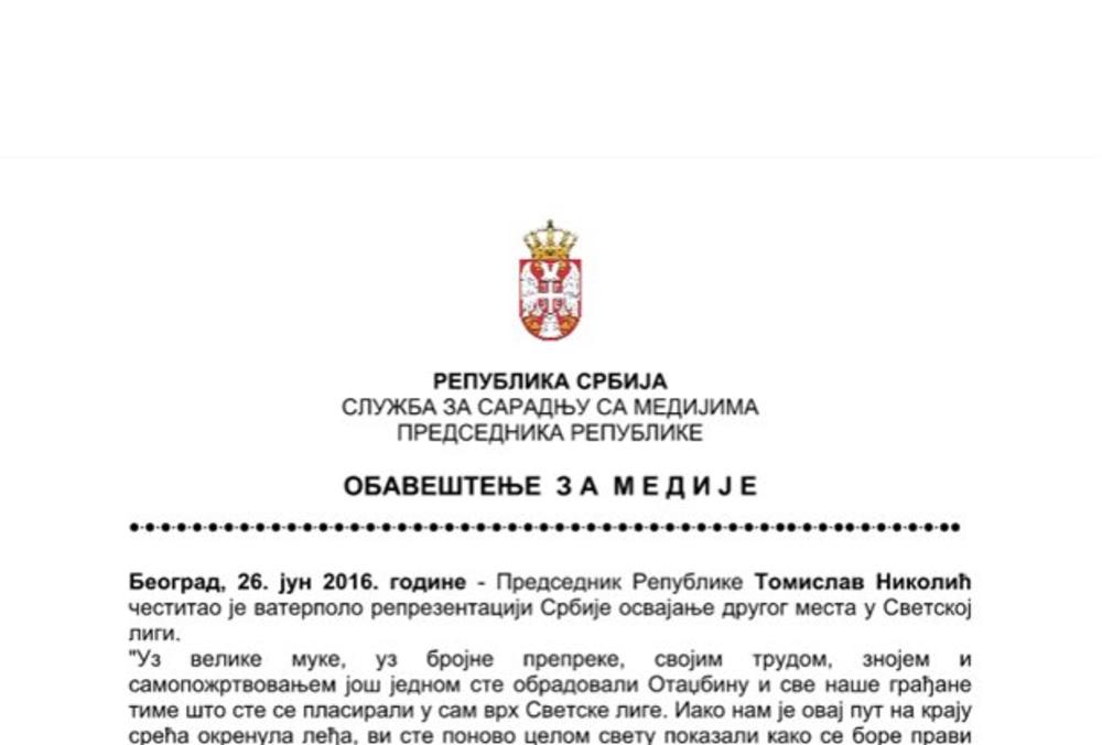 U kabinetu predsednika Srbije su požurili da čestitaju "delfinima", pa im se omakla velika greška