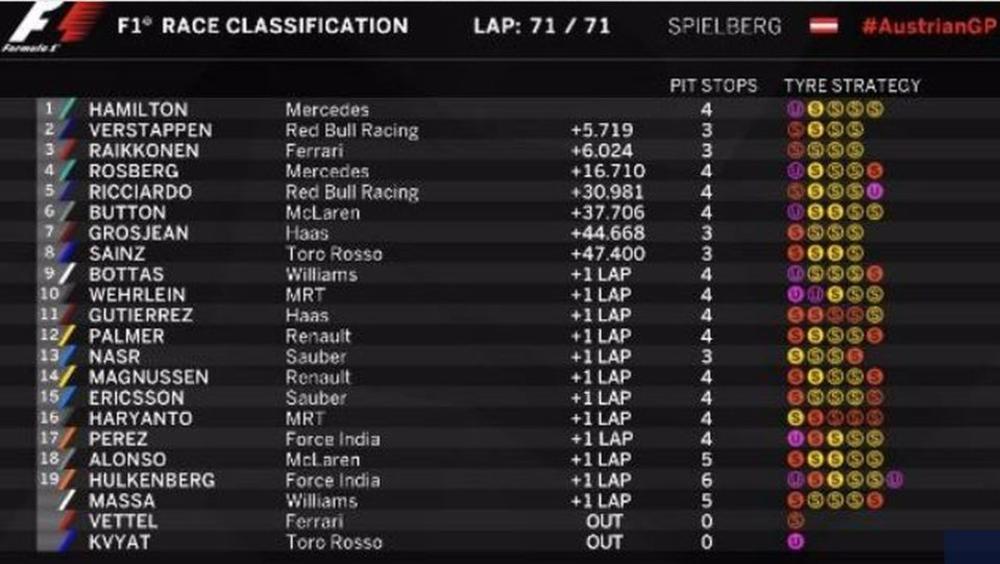 Hamilton je uspeo da se vrati na stazu i završi trku kao prvoplasirani, dok su Rozberga usled sve te gužve pretekli Maks Ferštapen i Kimi Raikonen.