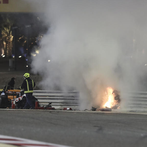 Bolid koji je vozio Roman Grožan se zakucao u zaštitni zid usled nekih problema i eksplodirao je.